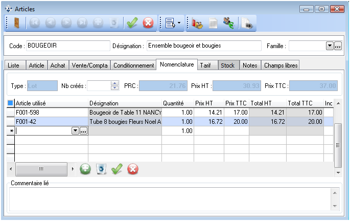 Double cliquer en dessous de la colonne « Article utilisé » pour indiquer les composants du lot. La quantité et le prix de vente peuvent être modifiés.