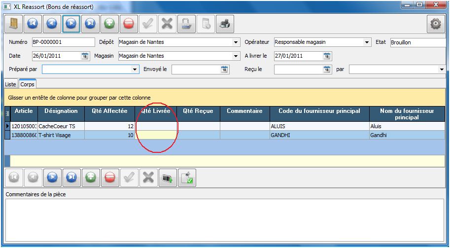 La zone référence est modifié avec la mention : Ecart de livraison No <Numéro du bon de réassort>