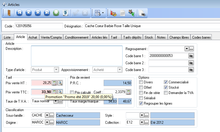 Si un article est en promotion, la zone Prix de vente HT et TTC de la fiche article est de couleur distincte et le prix promotion et le libellé de la promotion s’affichent dès lors que l’on passe la souris sur l’une des zones.