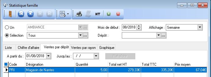 Sélectionner une famille ou toutes les familles, le mode d’affichage, le dépôt ainsi que le mois de début.