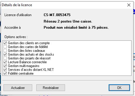 Permet de mettre à jour les informations liées à la licence (nombre d'accès Administrateur, nombre de caisses, modules optionnels).