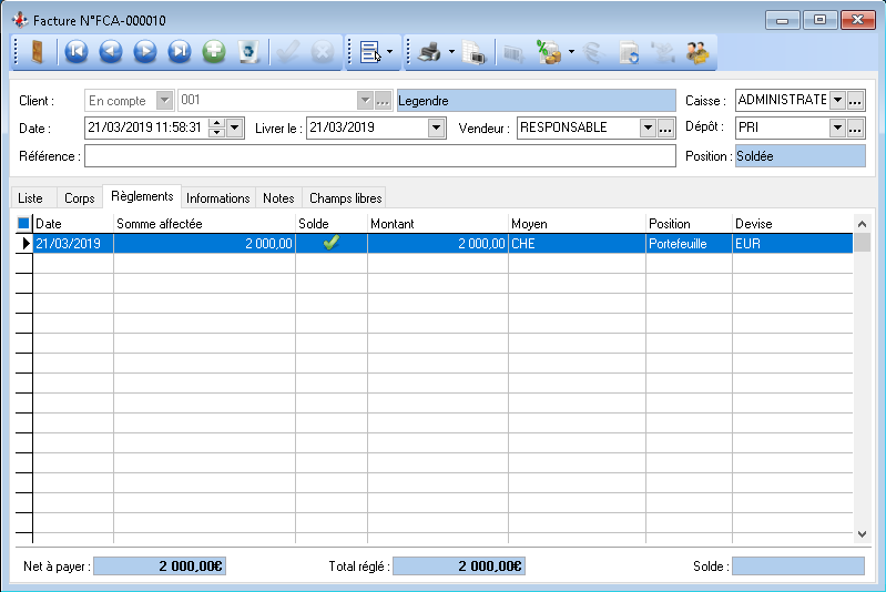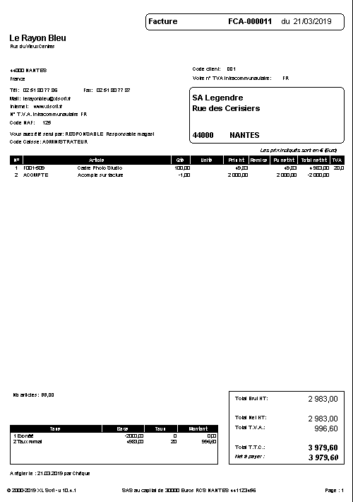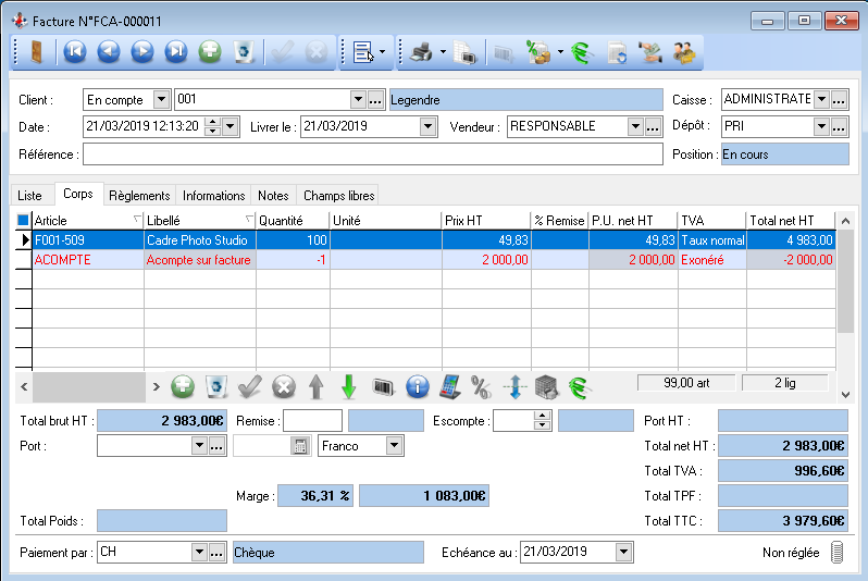 Saisir les articles vendus. Saisir l'article "ACOMPTE" avec la quantité "-1" et le même montant que celui de la facture d'acompte.