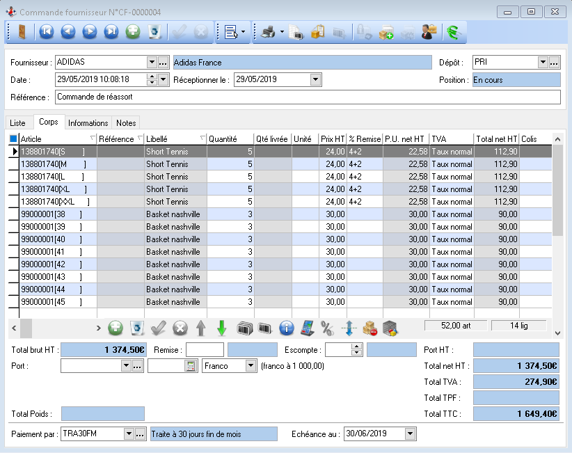 Les articles sont saisis selon la méthode habituelle (se référer à la saisie d’une commande fournisseur).