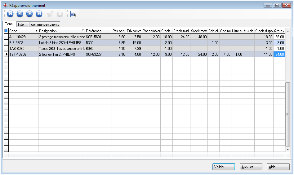 Appuyer ensuite sur le bouton « Valider » pour insérer les articles dans la commande fournisseur.