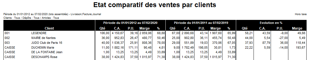 - Etat comparatif des ventes par clients : affiche l'évolution avec N-1 de la même période des ventes par clients