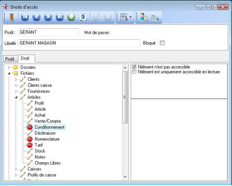 On peut également interdire la visualisation de certaines informations. Par exemple, sur le profil « Vendeur », le gérant du magasin ne souhaite pas que la marge sur les commandes clients apparaisse.