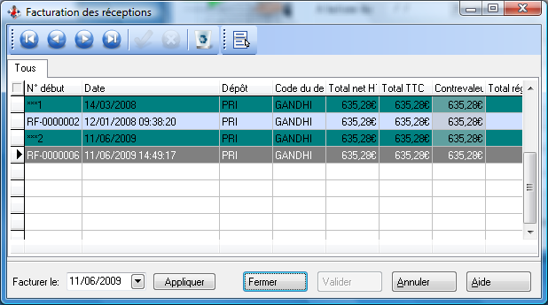 Indiquer une date de facturation identique pour les réceptions en saisissant une date dans la zone « Facturer le : » puis en appuyant sur le bouton « Appliquer ».