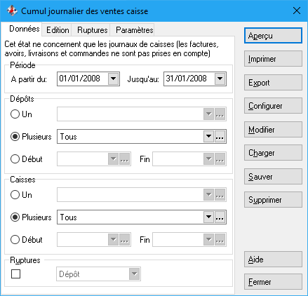 Cette édition permet d’afficher un récapitulatif des chiffres liés uniquement aux opérations effectuées sur les caisses.