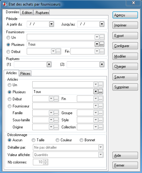 Pour cela, il faut déterminer les critères de sélection à l'aide d'une période, d'une sélection sur les fournisseurs, d'une sélection sur les articles.
