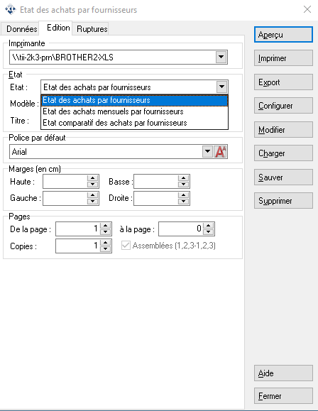 - Etat des achats par fournisseur : Affiche le détail des achats par fournisseurs