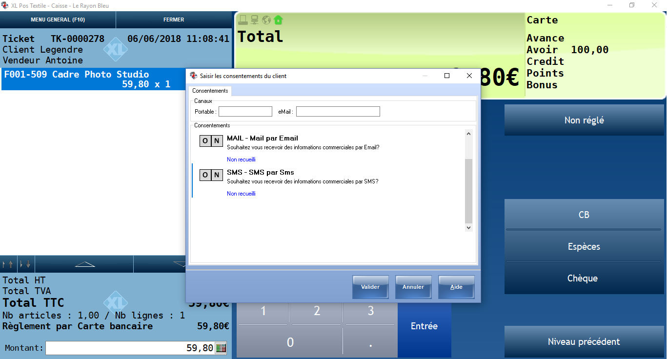 Suite au règlement client, la fenêtre d’acceptation des consentements s’ouvre si l’option ‘Demander en caisse’ est cochée