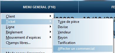 Vous pouvez affecter ou modifier le commercial sur une pièce via le « Menu Général F10 », « Ticket » et « Affecter un commercial ».