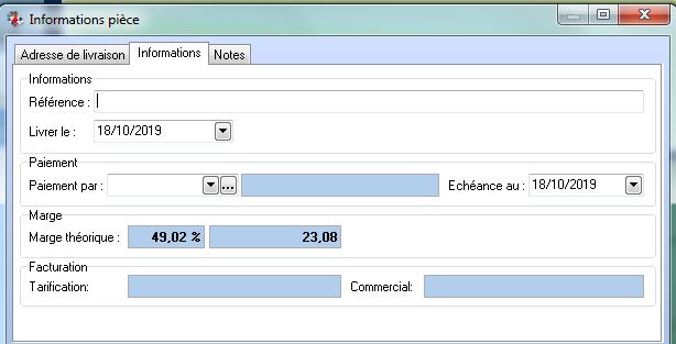 Via le « Menu Général F10 », « Ticket » et « Informations pièce », nous pouvons consulter et modifier les conditions de vente (Adresse de livraison, Date de livraison et le mode de paiement du client »