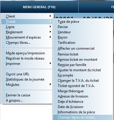 Pour accéder aux champs libres sur les pièces, il faut passer par le (« MENU GENERAL (F10) » « Ticket» « Champs libres du ticket »).