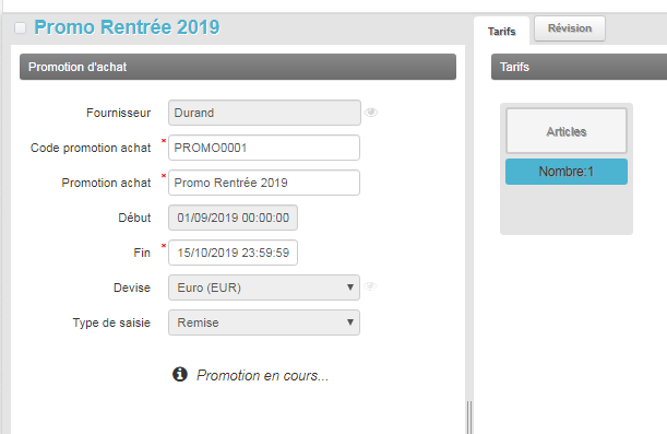 Vous pouvez ainsi saisir les remises ou les prix nets sur les articles bénéfiants de cette promotion.