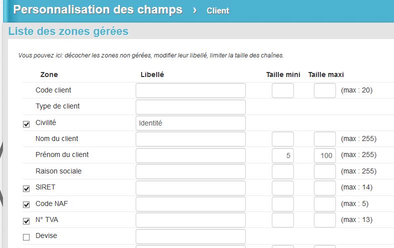 Il est possible de décocher des champs non gérées par exemple la devise du client (on décoche 'Devise').